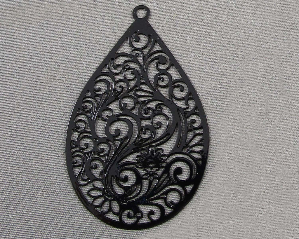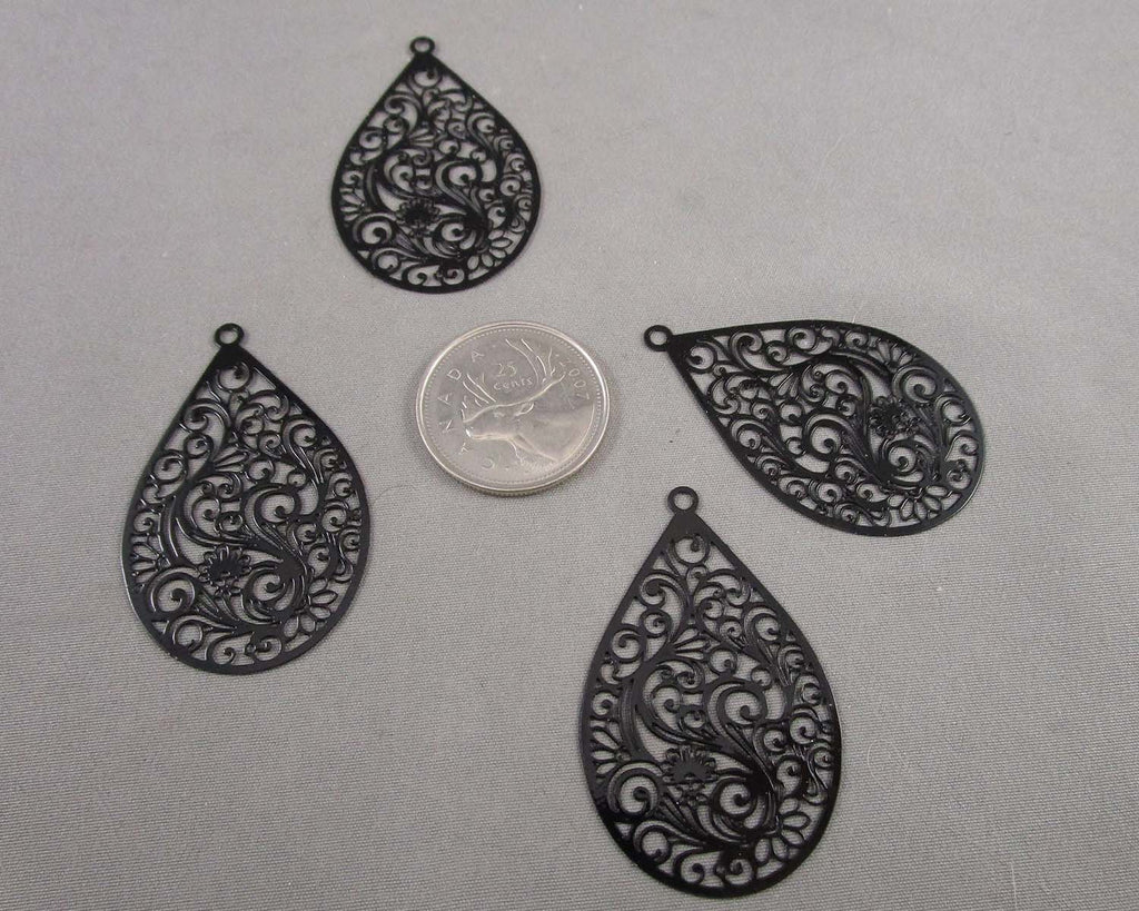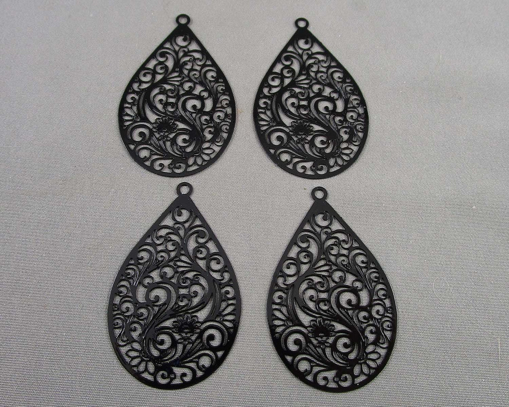 This listing is for 4 black stainless steel filagree pendant tear drop charms.