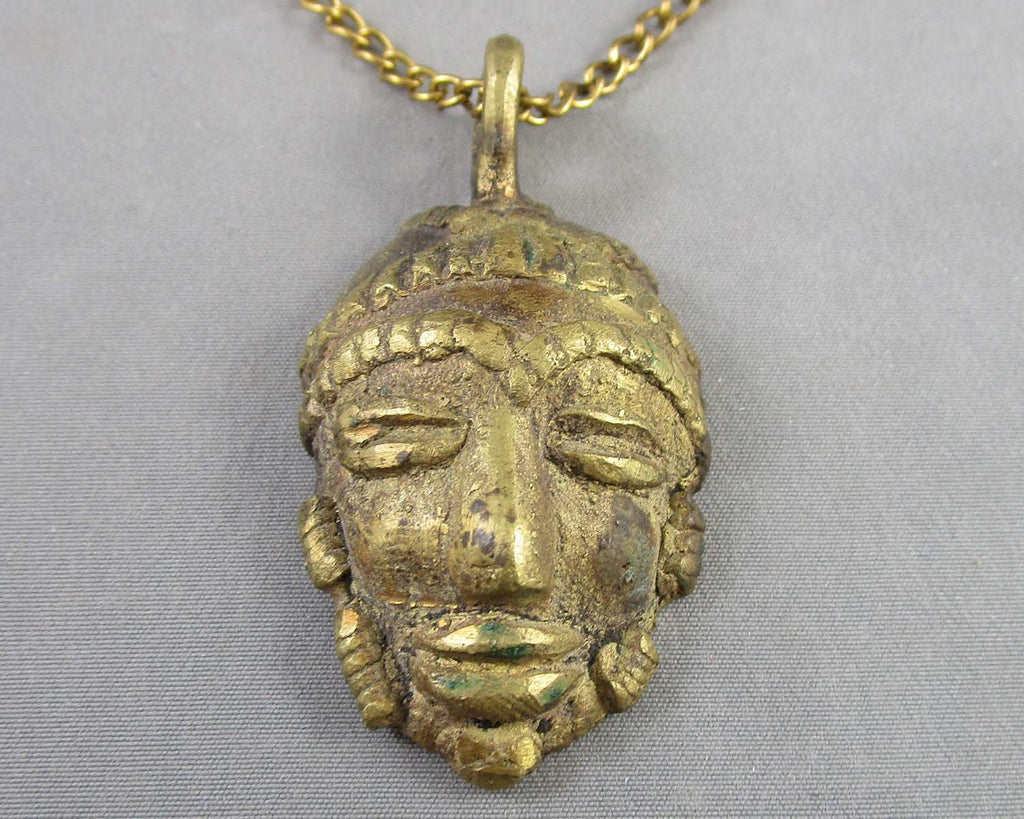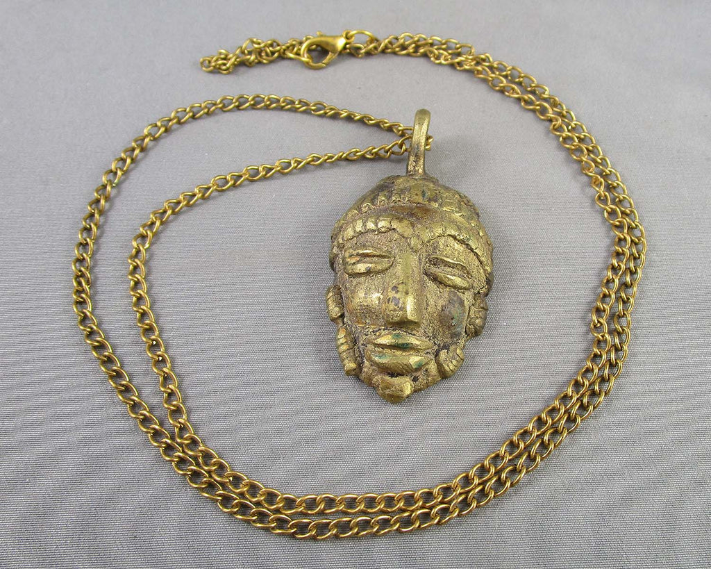 This listing is for a brass African mask pendant necklace. The pendant measures 2" x 1.15". The chain measures 27".