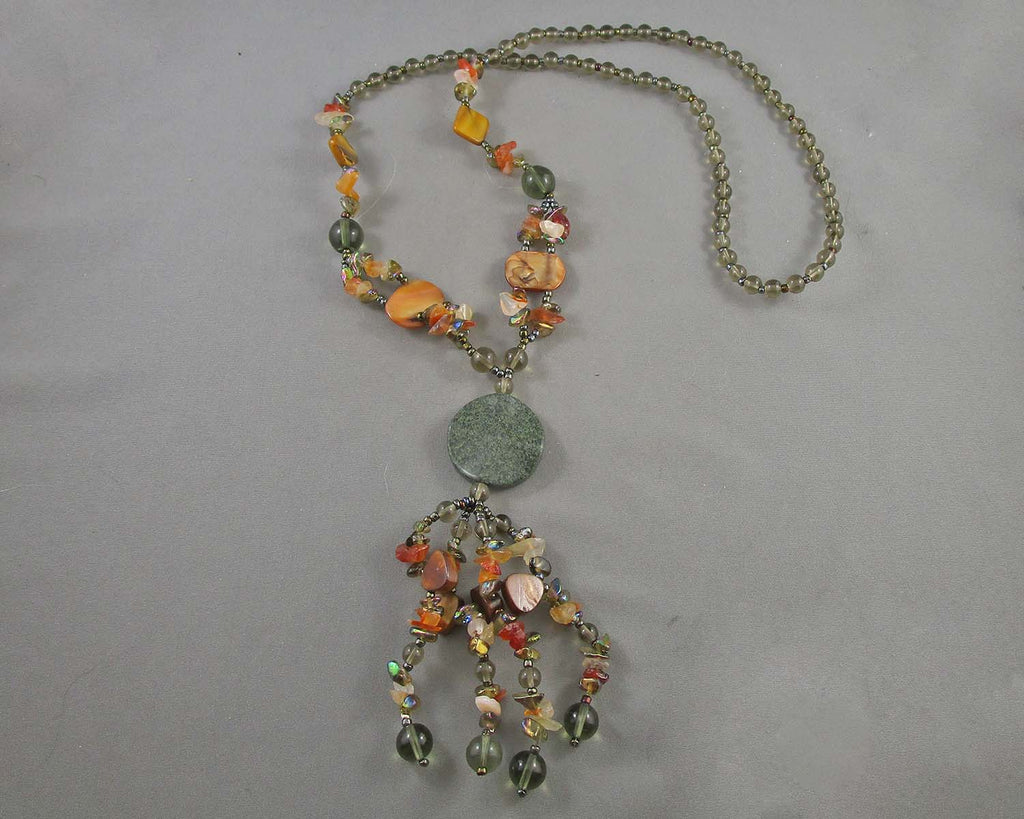 This listing is for a Carnelian, Shell & Green Jasper necklace. You will receive the exact necklace pictured. Measurement: 29"