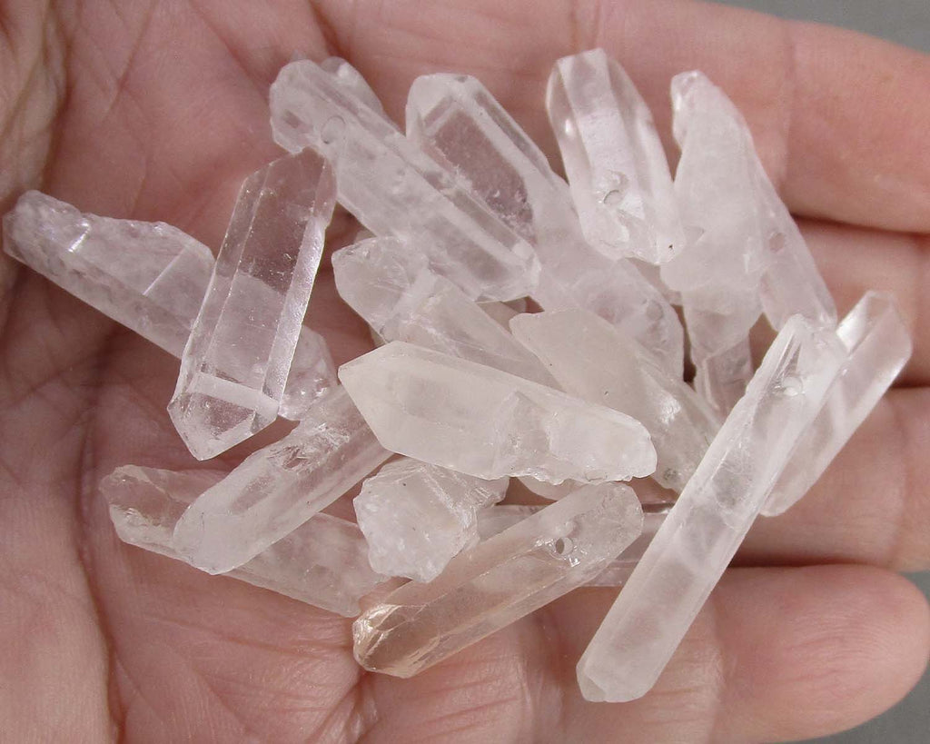 This listing is for 4 pieces of clear Quartz points (drilled). Size range - 0.75" - 1.5" (2cm - 3.8cm). These points are drilled and can be used for jewelry making.