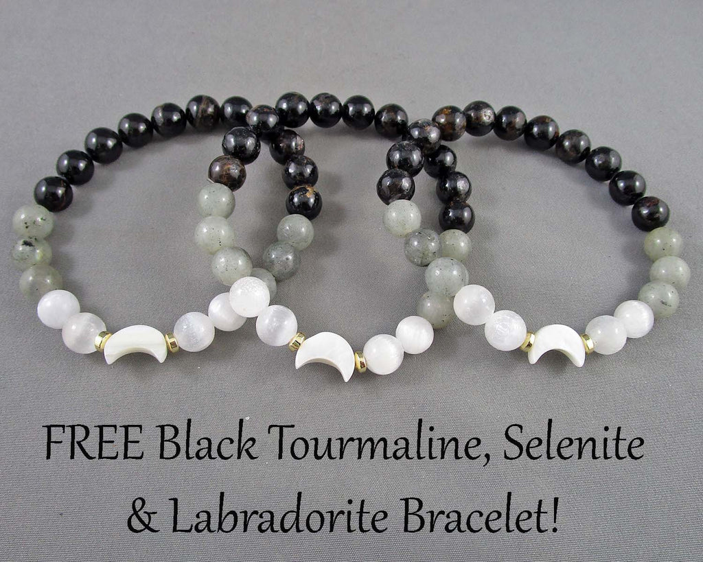Spend $60 or more online (not including shipping or discounts) and get one of these GORGEOUS Black Tourmaline, Labradorite and Selenite gemstone bracelets for FREE! (Retail value $25).