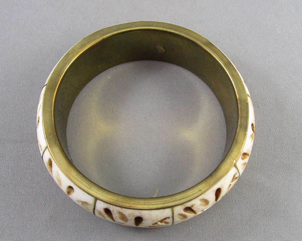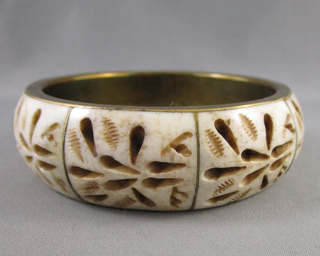 This listing is for a vintage carved bone bangle on brass.Β Inner diameter 2.75"