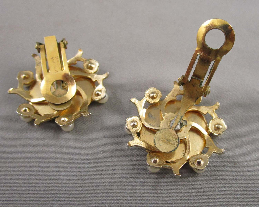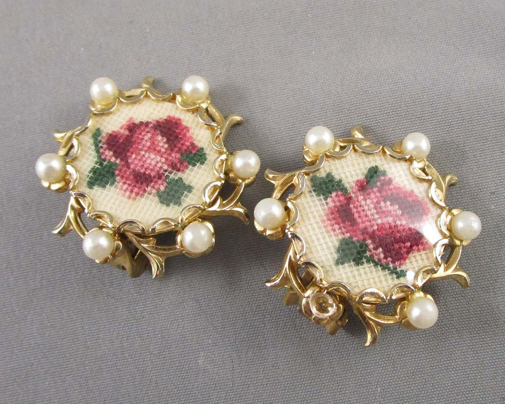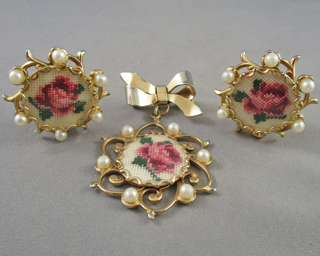 This listing is for a pair of Petite Point clip on earrings with matching brooch. You will receive the exact set pictured.