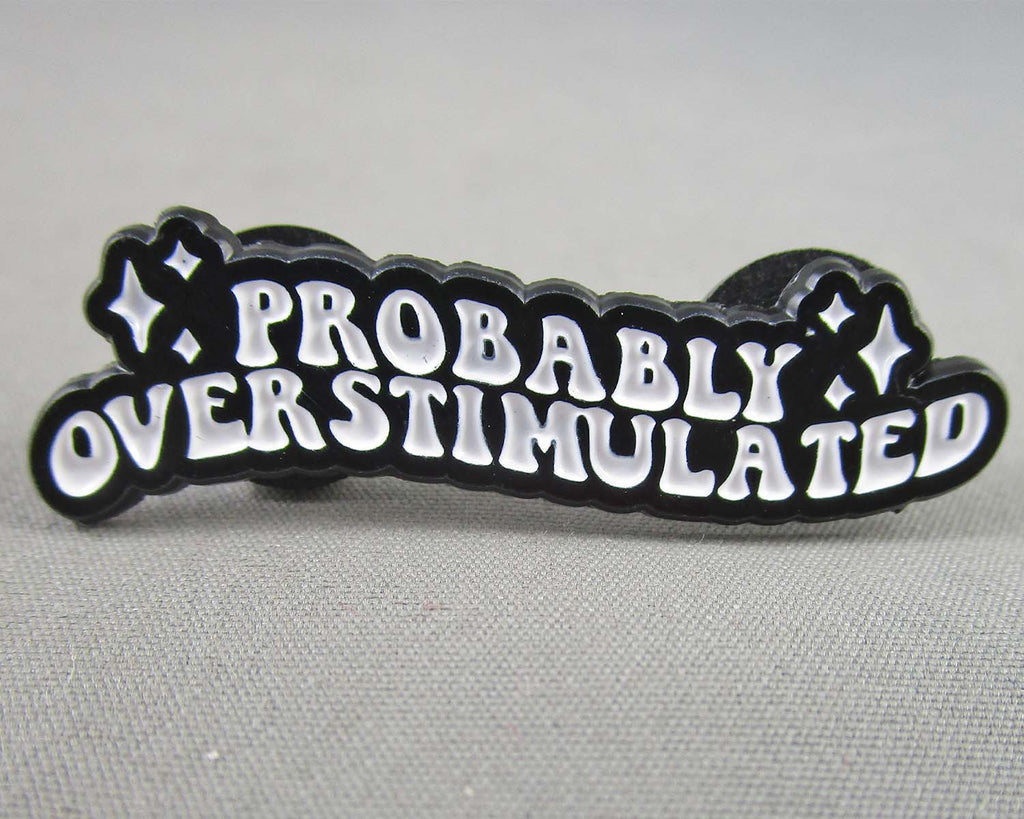 This listing is for an enamel pin that says "Probably Overstimulated"