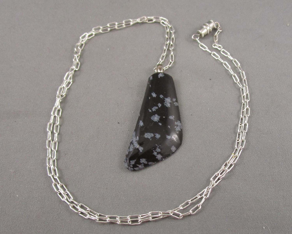 This listing is for a vintage Snowflake Obsidian gemstone 25: necklace. You will receive the exact necklace pictured. Pendant measurement 2" x 7/8" (5cm x 2.3cm)