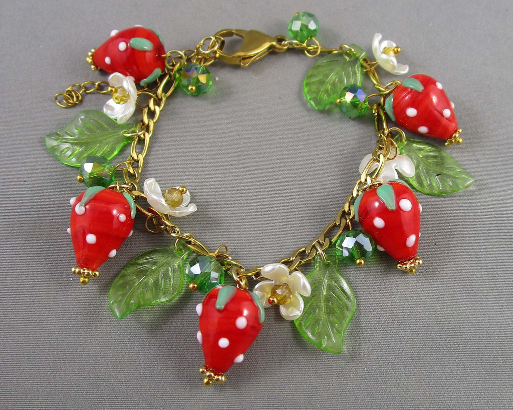 This listing is for a strawberry lampwork beaded bracelet. Adjustable length 7.5" to 9"