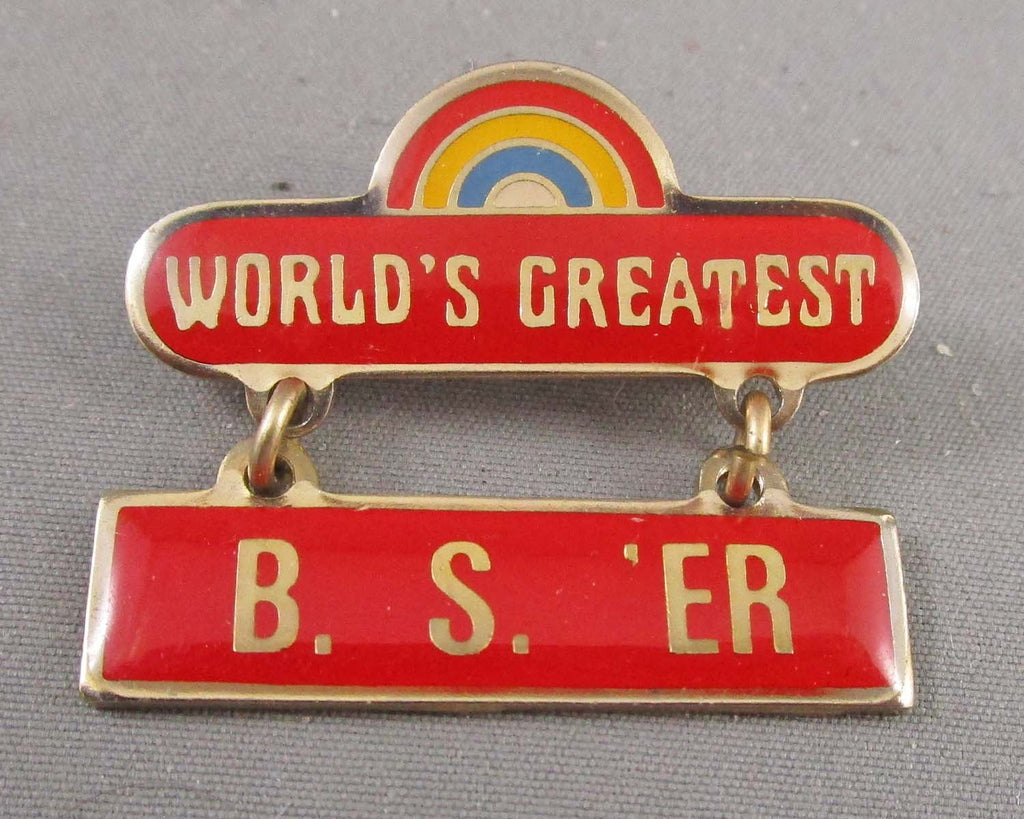 This listing is for a brooch that says "World's Greatest BS'er". Dated 1980